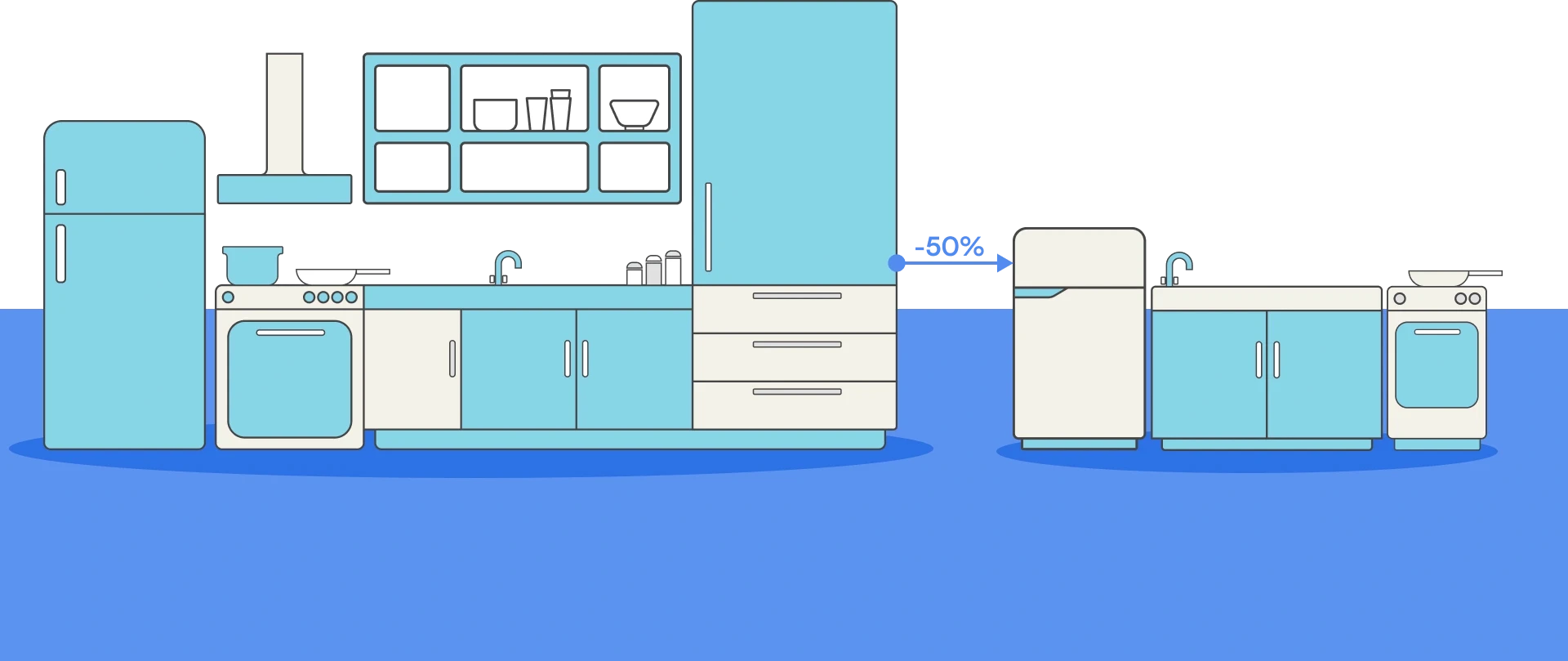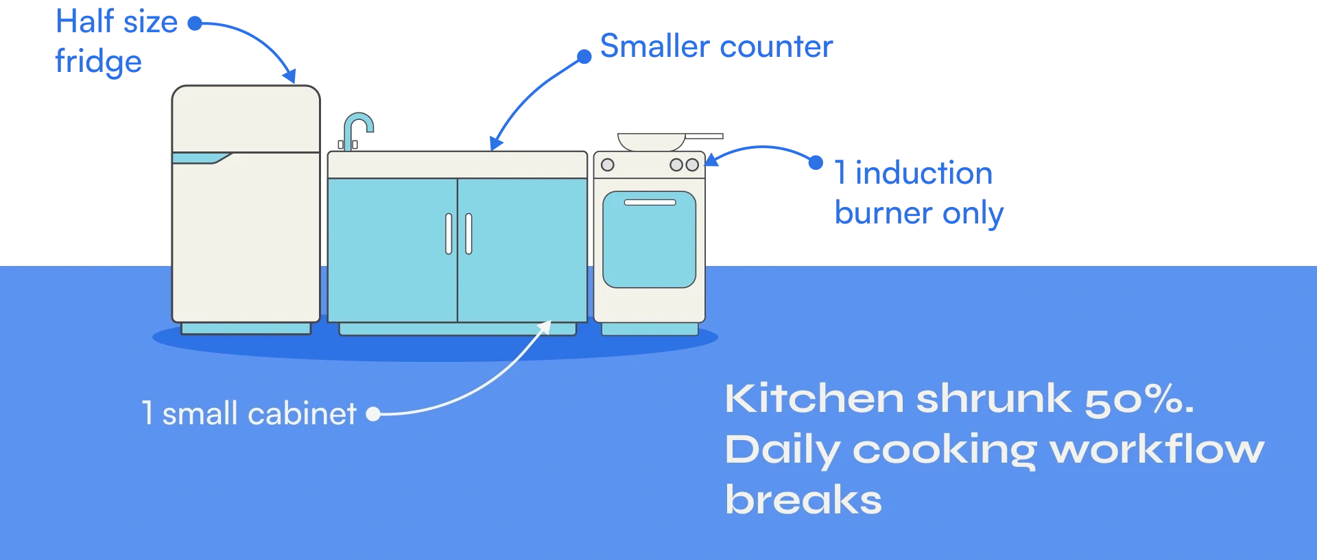 50% kitchen reduction eliminates daily cooking as a viable option.
